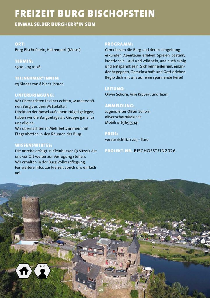 Kein Problem, das machen wir! In den Herbstferien, vom 19.10 bis zum 23.10.2026 fahren wir zur Burg Bischofstein an die Mosel. Dort haben wir eine Burg als Gruppe ganz für uns alleine!